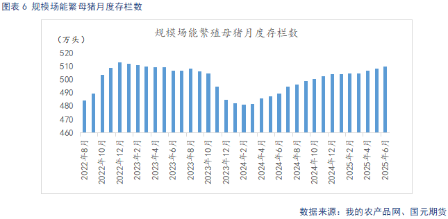 根据农业农村部数据显示,2025年6月末全国能繁母猪存栏量4043万头,同比上升0.1%,环比回升0.1%,根据农业农村部新修正的《生猪产能调控实施方案》,当前能繁存栏相当于正常保有量的103.6%,处于合理区间上限。24年12月至25年6月期间,环比趋稳、同比增幅有限,表明产能扩张势头已有所控制,后续仍需持续观察。不过24年4月至24年11月,能繁母猪存栏逐月环比回升,以生产周期推算,25年前三季度处于产能兑现期。