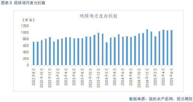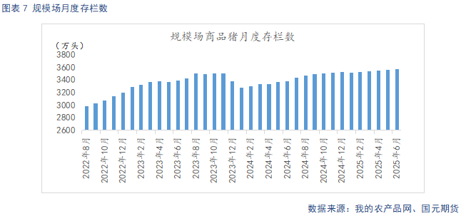 据Mysteel统计,截至2025年6月底,样本规模场能繁母猪存栏量为509.82万头,环比上调0.29%,同比增长4.2%。养殖有一定利润空间,尤其是6月下旬猪价迎来低位反弹,养殖利润走扩,去产能意愿不强,加之对市场存看涨预期,能繁母猪存栏延续增长趋势,从生产周期推算,2025年规模场理论产能呈现环比上升态势。样本规模场6月商品猪存栏数为3574.72万头,环比增加0.3%,同比增加5.63%。样本规模场6月商品猪出栏量为1076.82万头,环比增加1.6%,同比增加23.6%。6月,气温逐步升高,大猪出栏节奏加快。随着大猪存栏下降,7月初养殖端压栏、二育情绪升温,截留部分标猪猪源,出栏节奏放缓,支撑猪价走强。猪价上行后,养殖端认卖心态渐强,出栏节奏有所恢复。