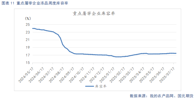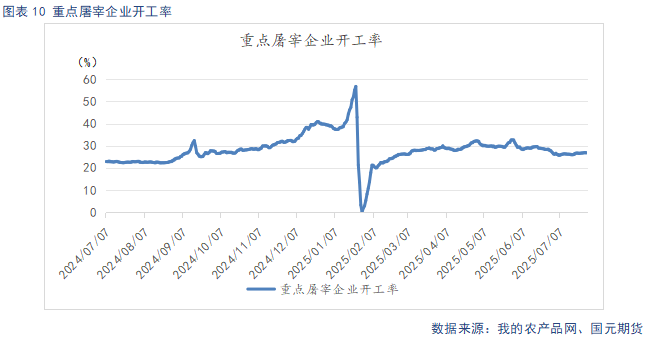 截至7月29日,重点屠宰企业开工率为26.75%,较上月末环比下降0.78%。冷冻肉库容率17.46%,较上月末环比上升0.05%。气候炎热,猪肉消费低迷,下游白条走货偏慢,屠企按需定宰,开工率维持低位窄幅波动。冻库库存方面,冻肉走货缓慢,且终端鲜销走货不畅,存在被动入库的现象,冻品库存去库缓慢。