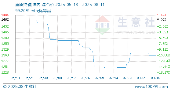 8月11日生意社重质纯碱基准价为1302.50元/吨