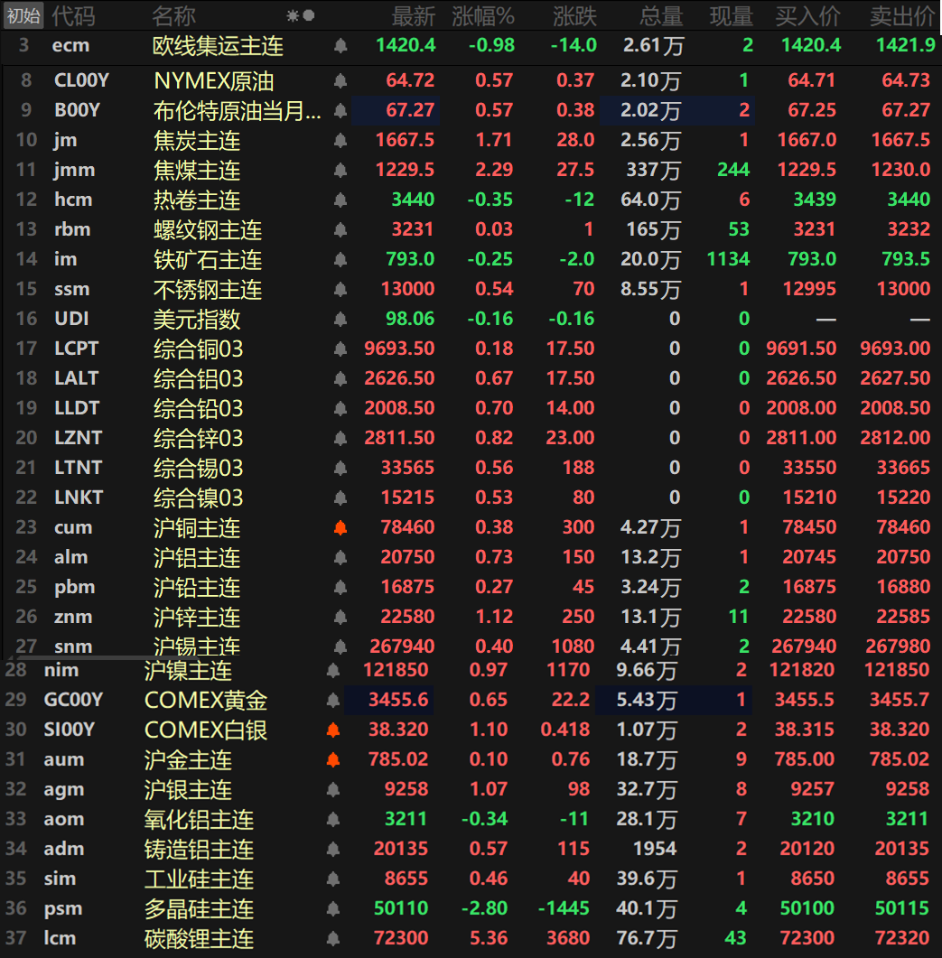 此外,碳酸锂主连涨5.36%,工业硅主连涨0.46%,多晶硅主连跌2.8%。欧线集运主连跌0.98%报1420.4。