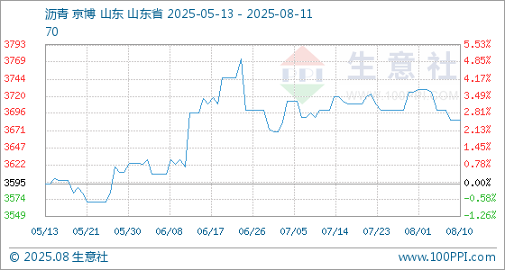 8月11日,生意社沥青基准价为3686.67元/吨,与本月初(3726.67元/吨)相比,下降了1.07%。