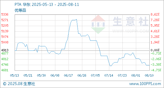 8月11日,生意社PTA基准价为4742.50元/吨,与本月初(4859.59元/吨)相比,下降了2.41%。