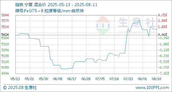 8月11日,生意社硅铁基准价为5490.00元/吨,与本月初(5528.57元/吨)相比,下降了0.7%。