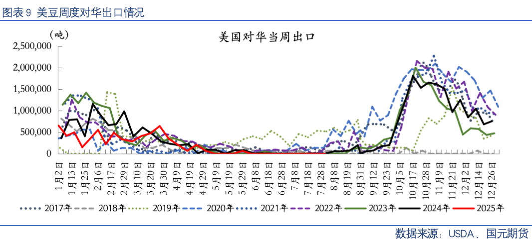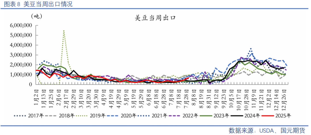 【出口销售报告:2024/25年度迄今美国大豆销售总量同比增长12.6%】美国农业部周度出口销售报告显示,截至7月31日,2024/25年度美国大豆销售总量约5149万吨,高于一周前的5110万吨,同比增长12.6%,已高于美国农业部7月供需报告中预估的全年出口目标5076万吨;2025/26年度美国大豆销售总量约358万吨,高于一周前的303万吨,同比减少20.8%。