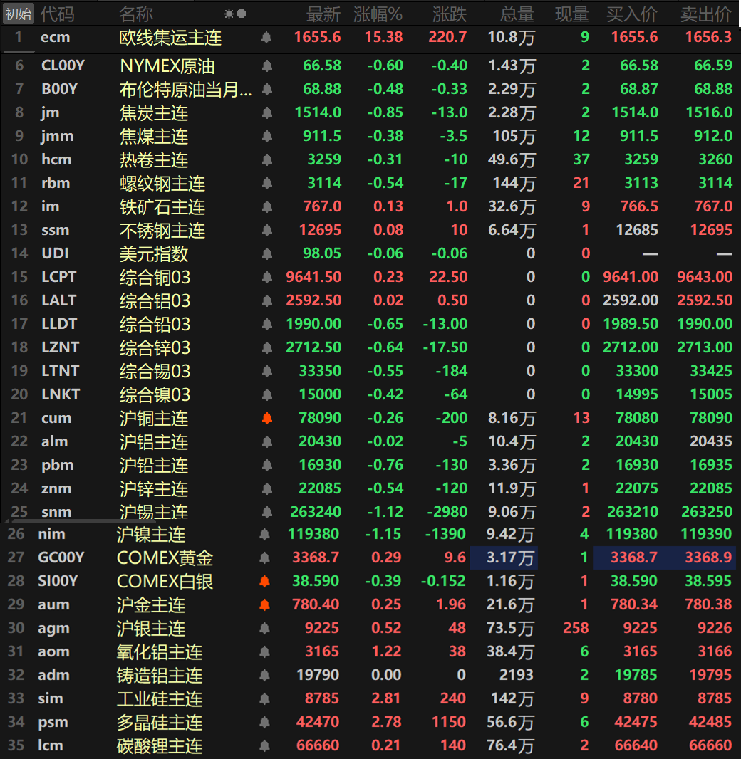 此外,碳酸锂主连涨0.21%,工业硅、多晶硅纷纷涨逾2%,工业硅涨2.81%,多晶硅涨2.78%。欧线集运主连大涨15.38%,报1655.6。