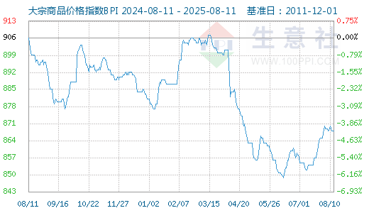 8月10日大宗商品价格指数BPI为868点,与昨日持平,较周期内最高点1343点(2021-10-19)下降了35.37%31.52%
