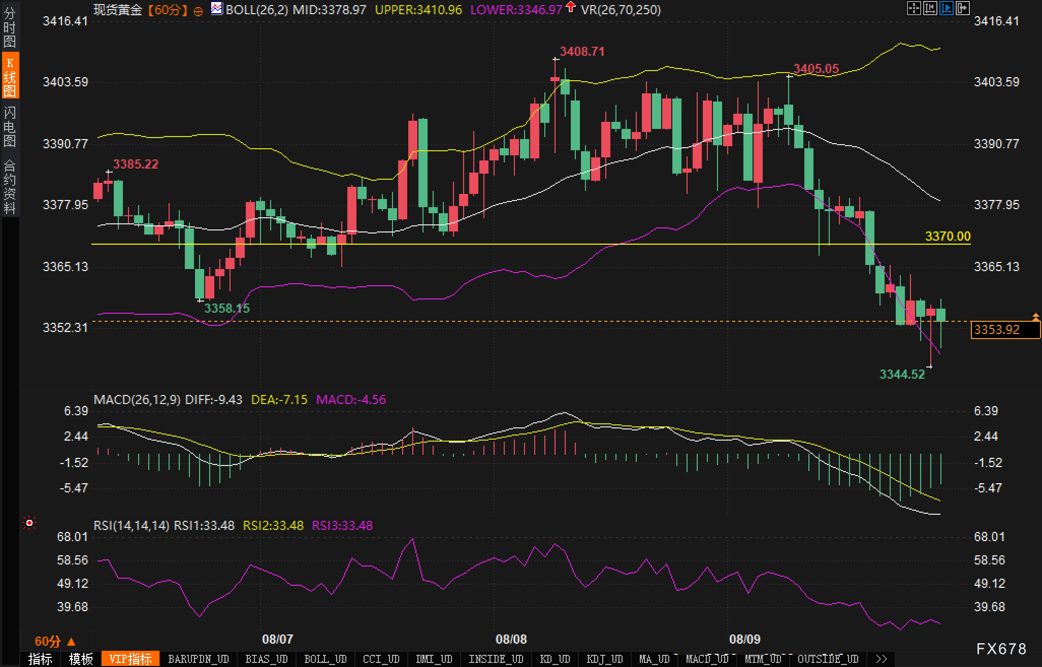 若通胀超预期粘性或零售、信心数据回弹,市场对9月降息的押注降温,10年期与长端收益率再度扬升,金价可能进入新一轮趋势下探。技术触发点在于3346.97—3344.52的下破与收盘确认,一旦形成“下轨放量跌穿 + 中轨下压”的组合,空头将把阻力下移至3370/3379一线,后续才会评估更低区域的潜在吸引力。需要强调的是,当前RSI未极端,若出现“破位后短促急跌”,仍需防范技术性反弹(均值回归)的扰动。