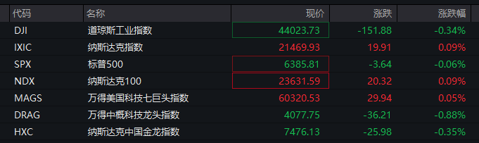 美股方面,截至发稿,美股三大指数涨跌不一,道指跌0.34%,纳指涨0.09%,标普500指数跌0.06%。