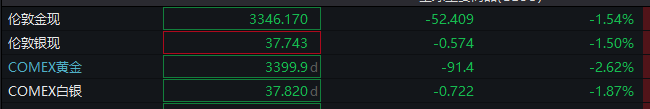 截至发稿,伦敦金现跌超1.5%,COMEX黄金跌超2.6%。