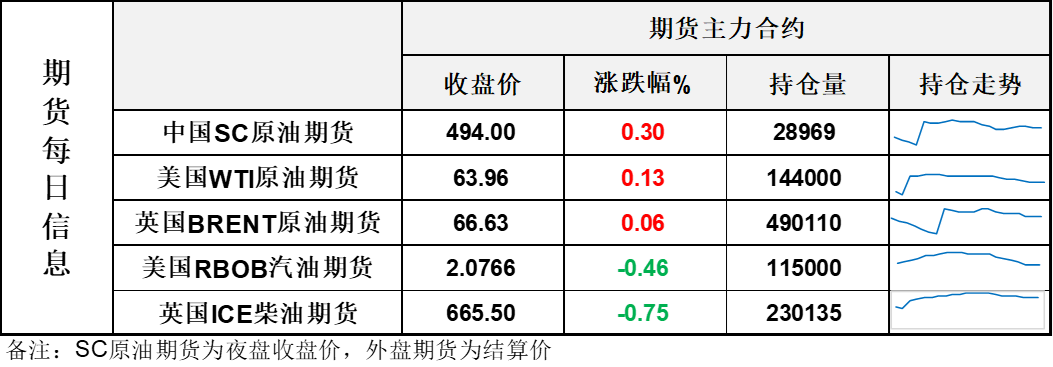 【1】WTI主力原油期货收涨0.08美元,涨幅0.13%,报63.96美元/桶;布伦特主力原油期货收涨0.04美元,涨幅0.06%,报66.63美元/桶;INE原油期货收涨0.3%,报494元。