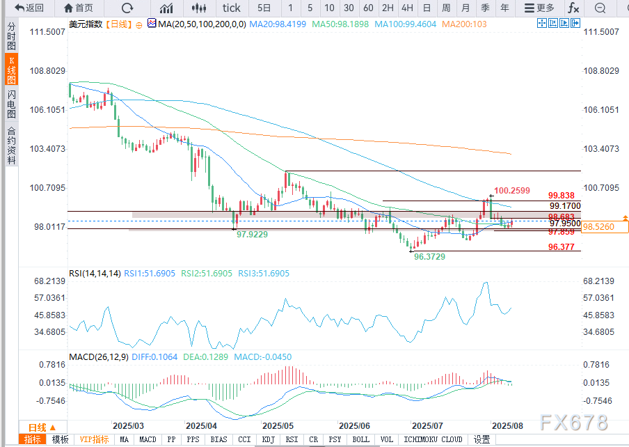 汇通财经APP讯——周一(8月11日)美盘时段,美元走势略显强劲,稳稳站在50日移动平均线98.200上方。上周美元指数曾跌至97.945——恰好在短期回撤区间的中部——但买家似乎守住了这一支撑位。