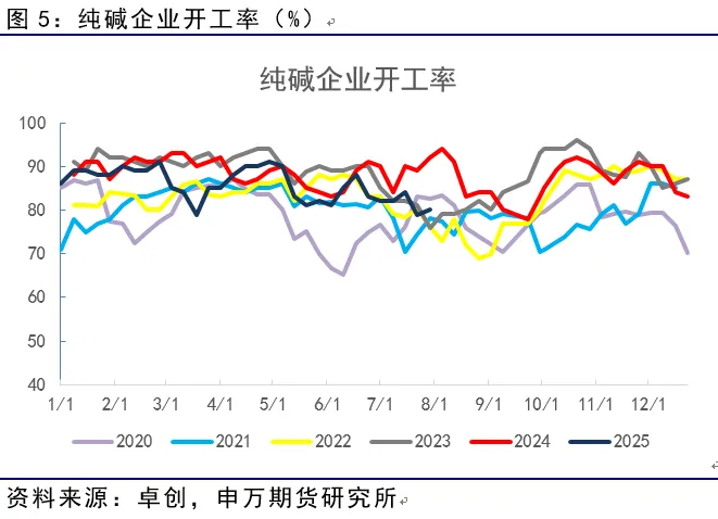 7月至今国内纯碱期货先扬后抑,市场长期看反内卷,中期看供需的格局逐步明朗。基本面上,纯碱作为玻璃生产的原料,其价格运行趋势受到供需端的显著影响。需求端上,平板玻璃作为重碱的主要下游,近些年受到房地产产业周期调整的冲击,需求处于逐步收缩的状态,因此,行业从24年开始就进入了产量下降,这点对于纯碱这块生产原料的需求冲击较为明显。纯碱行业整体供给今年以来就处于一直缓慢调整,试图达到供需平衡。然后,纯碱行业的供给调整的路程是曲折的,一方面,纯碱自身的整体产能处于增长态势。不同工艺的产能投产,使得市场一定程度上处于产能互相竞争的格局,因此,行业角度,虽然平均开工率同比下降,不过,产量角度确实增加的。在供给端的效果未能追赶上玻璃需求变化的状态下,今年大部分时间纯碱生产企业的库存持续处于高位,供需承压的预期延缓了产业修复的节奏。在这样一个供需纠缠的状态下来,迎来反内卷为核心的预期性行情。7月盘面和现货价格也一度有快速的反弹。不过,当市场的短期热度过后,市场焦点重回供需面。实际上7月上旬虽然盘面和现货有提价,不过,在行业库存方面并没有出现显著的消化,一定程度上表明下游玻璃消费处于淡季,纯碱自身供需修复的乏力。当然,从期货远期合约的情况来看,目前供需偏宽的市场预期依然存在。因此,整个7月行情集中反映了短期纯碱供给端修复的曲折,尤其是夏季降负生产和装置检修对于平衡供给的重要性。