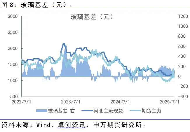 7月国内玻璃期货价格在前期连续反弹之后,大幅回吐涨幅。基本面角度,玻璃需求由于房地产行业处于相对的弱势周期,因此自24年就开始了行业的供给与需求的深度调结构。实际上,在24年的4季度一度也有些成效。不过,今年以来,由于供需在兑现节奏上的不同。虽然玻璃日融量并没有太大的反弹,不过,玻璃生产企业的库存持续处于阶段性累库的同比高位。也因此,2509期货合约在6月份也再次跌破了千元的心理价位。实际上,在本轮的前期下跌的过程当中,玻璃的生产现金流持续处于较差的状态,行业的供给调节进入了痛点区域。在这样的状态下,7月反内卷的预期为主的行情风口吹到玻璃时,盘面价格就出现了大幅的反弹。毕竟,从产业调整之实的角度来看,平板玻璃产业确实有所动作。不过,行情的发展是迅速的,产业的调整是长期的。盘面价格的快速升温代表了现货市场对于供需修复的热情,但也反衬出供需修复的艰难。7月下旬,伴随着期货市场的降温,市场时点回归基本面的自身,尤其是当市场情绪较好时玻璃自身能否有效展开供需消化。实际上观察到的是,玻璃的日融量上周小幅反弹,同时生产企业的库存虽然总体在淡季保持了逐步消化的状态。不过,考虑玻璃日融量的回升以及现货库存水平仍在5000万重箱之上的水平。因此,7月的玻璃一度的突进行情更多依然带着预期的性质。
