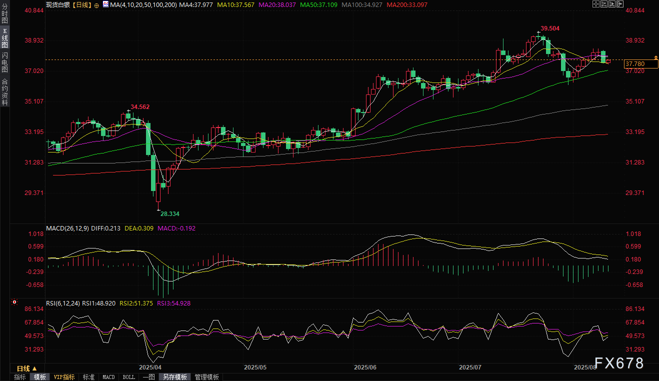 反之,若白银跌破37.50美元,则可能下探50日移动均线37.03美元。若跌势持续,下一支撑位将看向7月31日摆动低点36.22美元。