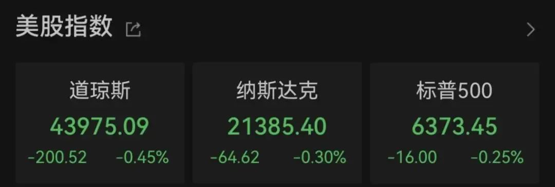 美东时间8月11日,美国三大股指本周开局收跌,道指跌200.52点,跌幅为0.45%,报43975.09点;纳指跌64.62点,跌幅为0.30%,报21385.40点;标普500指数跌16.00点,跌幅为0.25%,报6373.45点。