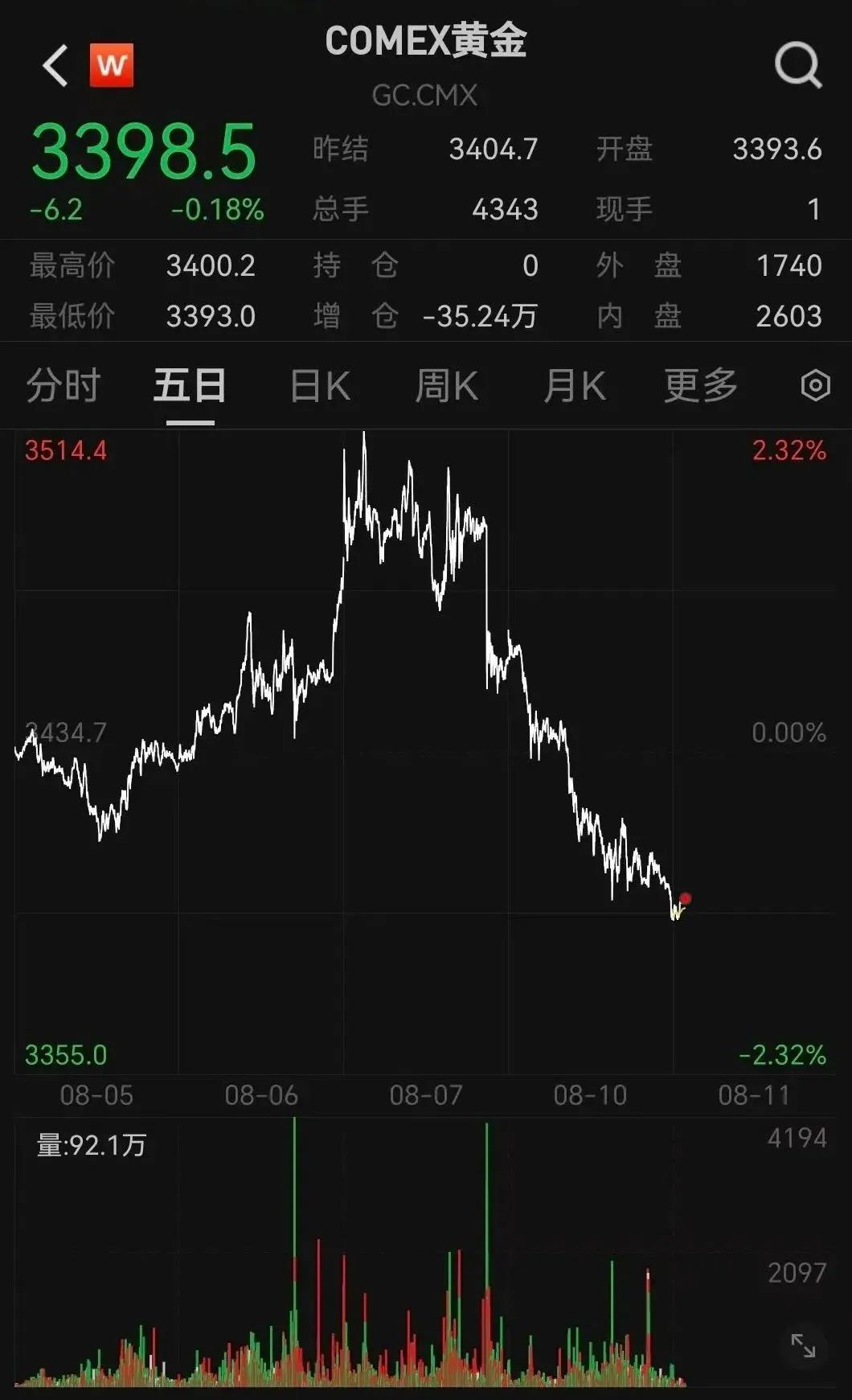 纽约商品交易所近月黄金期货合约美东时间8月11日重挫近2.5%,盘后失守每盎司3400美元,创今年5月以来最大跌幅。