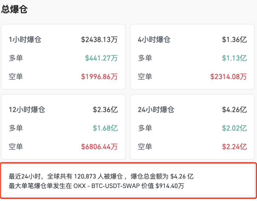 在加密货币价格剧烈波动的背景下,全球爆仓人数大幅飙升。据CoinGlass最新数据,最近24小时内,全球共有120873人爆仓,爆仓总金额达4.26亿美元(约合31亿元人民币)。