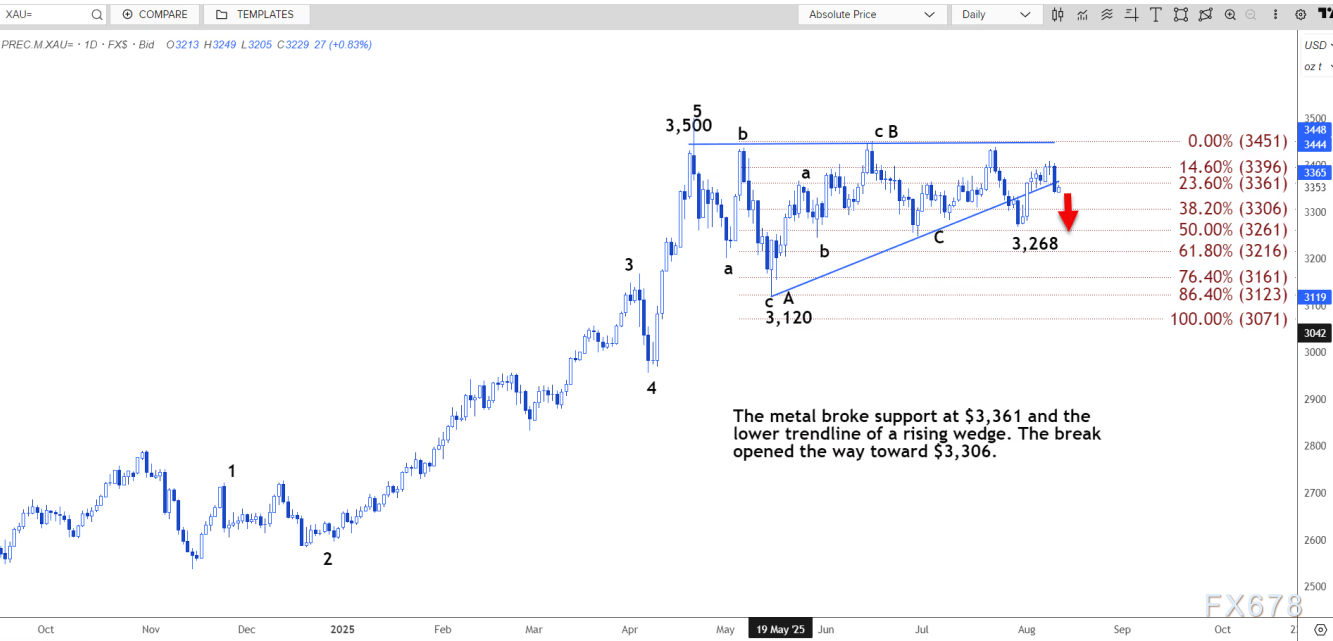 跌破3342美元后,金价可能跌至3302至3322美元区间。日线图显示,金价跌破3361美元的支撑位以及上升楔形的下沿趋势线。