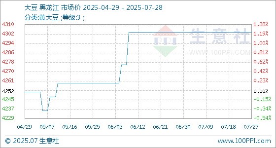 7月28日,生意社大豆基准价为4304.00元/吨,与本月初持平。