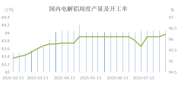 截止8月7日,我国电解铝周度运行产能4395.97万吨,较前一周增加5万吨,周度产量维持在84.06万吨,电解铝产能置换下,云南电解铝运行产能提升。