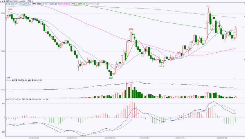 8月12日日盘氧化铝主力2509合约大幅拉升,重心自低位上移,盘中涨幅逾3%,截止下午收盘报3308,涨幅4.16%。