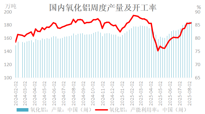(2)供需端。截至8月8日,全国冶金级氧化铝运行产能9580万吨,周度产量为185.1万吨,较前一周增加0.4万吨。近期西南某氧化铝企业焙烧检修工作结束,已恢复满产运行,不过交口某氧化铝厂因降雨导致当地国产铝土矿开采受限被迫减产一条生产线。