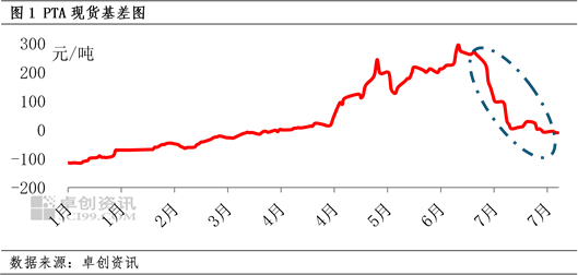 PTA现货供应充足是现货基差持续走弱的主因,一方面7月PTA装置检修不多且PTA新产能开始试车,PTA月产量在历史高点;另一方面PTA主力供应商持续出货,现货流通量充足,并未因台风等天气因素出现排货偏慢、局部货少等情况。需求端,买方缺乏投机囤货的意向,宏观方面的不确定性以及部分聚酯产品理论生产亏损导致聚酯工厂对PTA现货采购积极性不高。尤其是月初,下游企业消耗长约PTA货源,在现货市场观望为主。