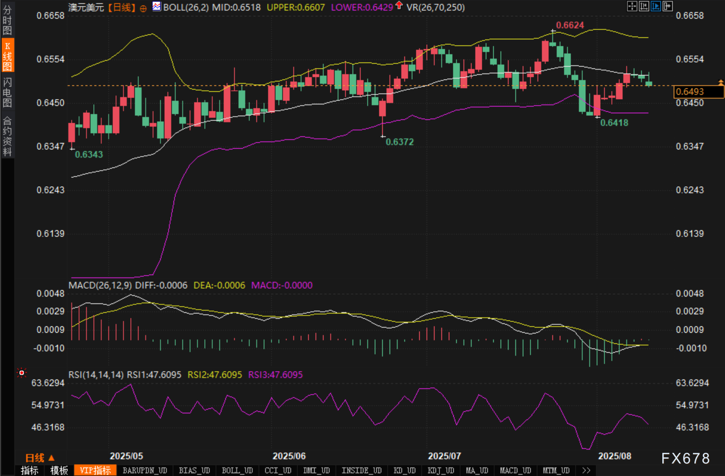 从技术角度分析,澳元兑美元日线图显示出明显的盘整走势特征。汇价目前运行在一个相对狭窄的横盘通道内,上方面临0.6607的阻力位,下方则获得0.6429的支撑。布林带指标显示波动率处于收缩状态,上轨位于0.6607,下轨在0.6429,中轨维持在0.6518附近,表明市场正处于整理阶段。