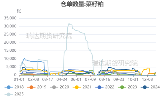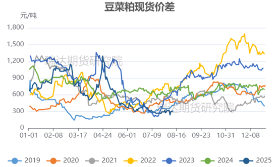 然而,对于近月2509合约而言,临近交割市场对其交易热情明显下滑,持仓逐步向远期合约转移,且近期部分菜粕交割库新增仓单快速回升,使得市场对交割品不足的担忧得到缓解,更加弱化多头热情,平仓了结意愿增加,期价也大幅下跌。另外,豆菜粕现货价差持续处于近年同期最低位,豆粕替代优势凸显,弱化菜粕需求,也牵制近月价格表现。