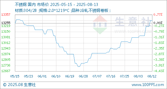 8月13日生意社不锈钢基准价为13287.50元/吨