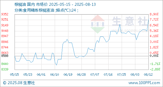 8月13日生意社棕榈油基准价为9268.00元/吨