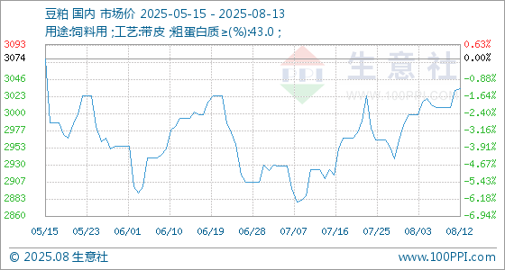 8月13日,生意社豆粕基准价为3034.00元/吨,与本月初(2984.00元/吨)相比,上涨了1.68%。