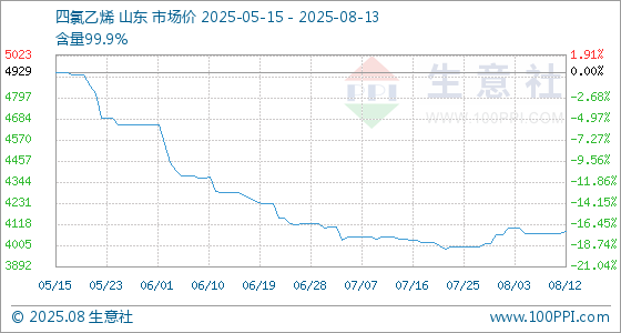 8月13日生意社四氯乙烯基准价为4077.27元/吨