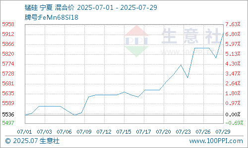本月底阶段内“反内卷”利好情绪持续发酵和行业扩圈,黑色系情绪偏强主导下,叠加原料价格探涨,锰硅期货行情大幅上涨,甚至一度出现涨停,锰硅现货价格随之跟涨,工厂挺价意愿坚决。据生意社商品行情分析系统,本月末硅锰宁夏地区的市场报价在5900-6100元/吨左右,市场均价5920元/吨,较月初上涨6.94%。