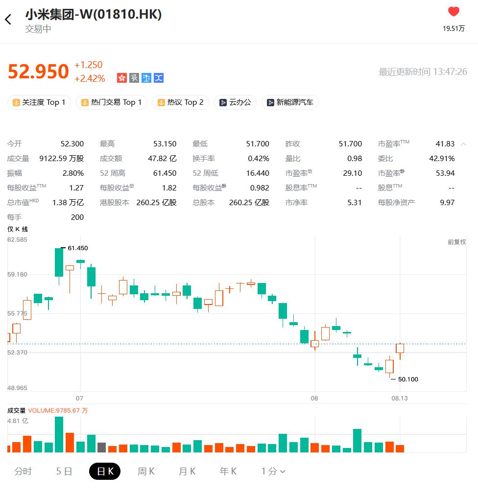 截至IT之家发稿,小米的股价为 52.95 港元(现汇率约合 48.5 元人民币),相比昨日增幅达 2.42%,总市值 1.38 万亿港元(现汇率约合 1.26 万亿元人民币)。