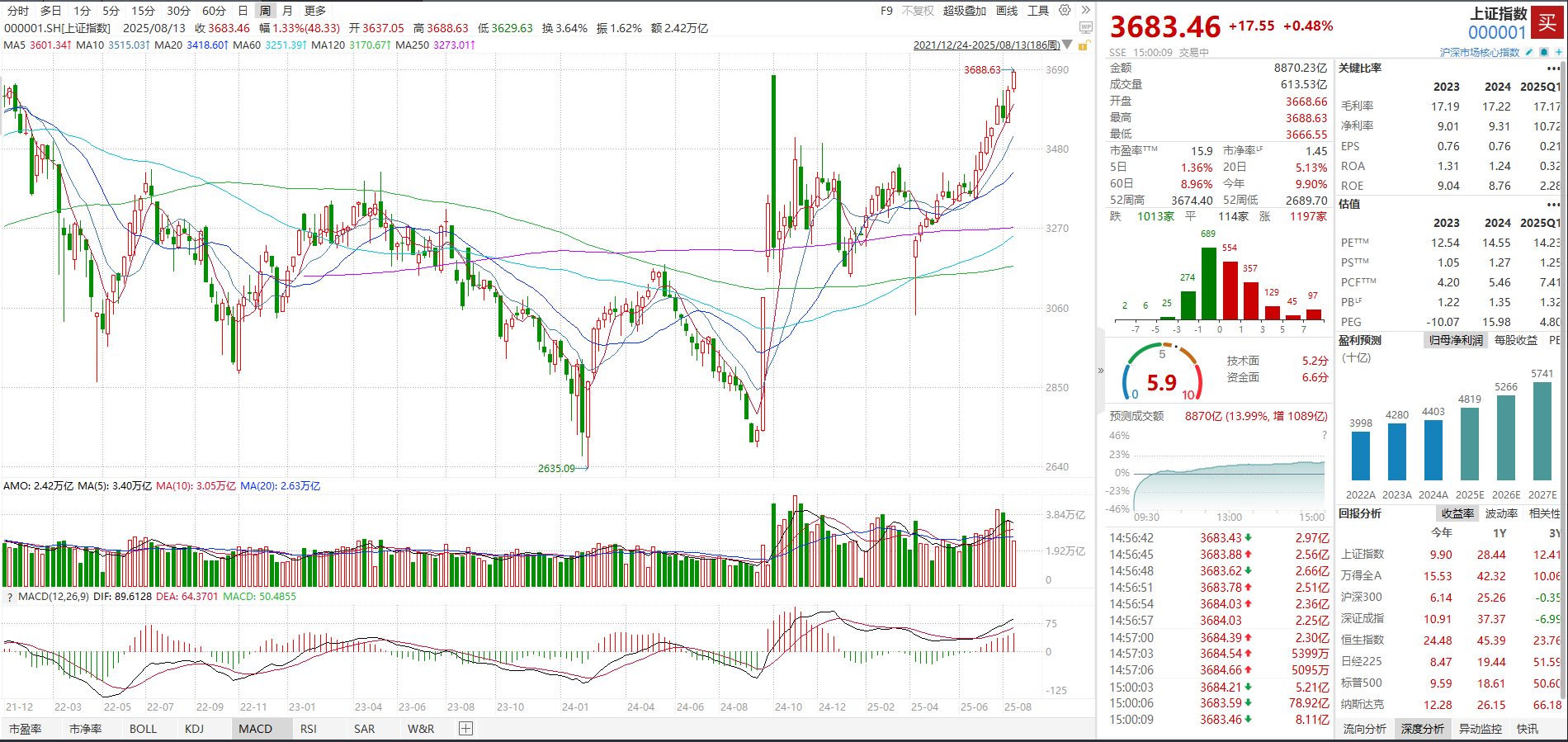 8月13日,A股市场全天震荡走高,三大指数集体走强。截至收盘,创业板指涨3.62%,报2496.50点;上证指数涨0.48%,报3683.46点;深证成指涨1.76%,报11551.36点。全市场超2700只个股上涨。沪深两市全天成交额2.15万亿元,较上个交易日放量2694亿元,时隔114个交易日重回2万亿元上方。
