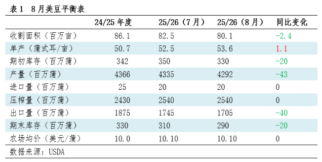 美国农业部公布的8月平衡表,结束了近两个月的平稳状态,变动较大,尤其是供应端多个因素的变动,导致市场预期开始变化。从最为关键的面积和单产数据看,环比7月一涨一跌,其中收割面积预估为8010万英亩,市场预期为8256.1万英亩;单产预期为53.6蒲式耳/英亩,市场预期为52.9蒲式耳/英亩。综合导致产量为42.92亿蒲式耳,市场预期为43.65亿蒲式耳。综合来看,产量预估无论是环比还是与本月的市场预期相比,均出现下滑,供应端数据的下滑,预期的收紧,对美豆期货价格形成偏利多影响。