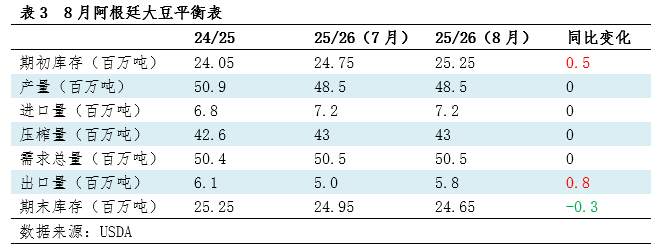 阿根廷平衡表在8月份有所微调,主要是旧作24/25年度的变动,传导至25/26年度的期初库存环比7月份小幅上调50万吨,以及25/26的出口量预期上调80万吨。期初库存的变化,主要是24/25年度的阿根廷大豆产量上调100万吨至5090万吨,进口量上调30万吨至680万吨,需求总量上调80万吨至504万吨,期末库存上调50万吨至2525万吨。而25/26年度出口量的上调,主要是挤占了部分美豆的出口份额。综上,阿根廷25/26年度需求预期有所增加,对美豆期货价格影响为中性偏多。