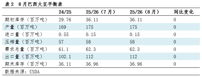 8月报告显示,24/25年度产量维持1.69亿吨,25/26年度大豆产量预估维持为1.75亿吨,两者环比均稳定。目前巴西大豆处于出口时间,新季大豆尚未播种,以销售24/25年度货源为主,而需求端数据环比稳定,报告数据均无变化,因此巴西大豆市场在7月份运行平稳,平衡表对美豆的影响呈现中性。