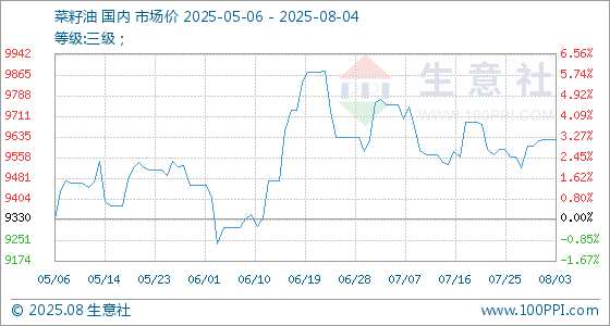 8月4日生意社菜籽油基准价为9623.33元/吨