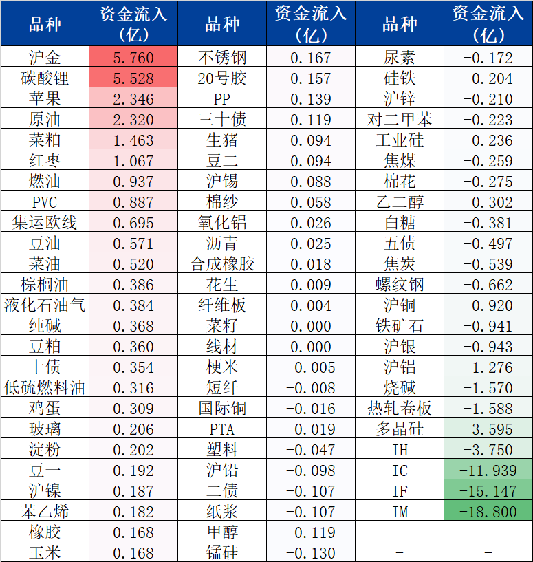 资金流入前三名为沪金、碳酸锂和苹果;流出前三名分别为IM、IF和IC。
