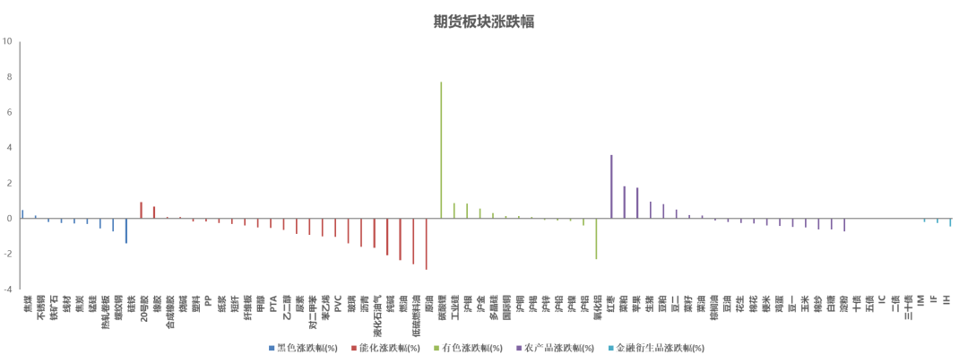 从板块整体表现看,有色多数上涨,能化、黑色多数下跌。