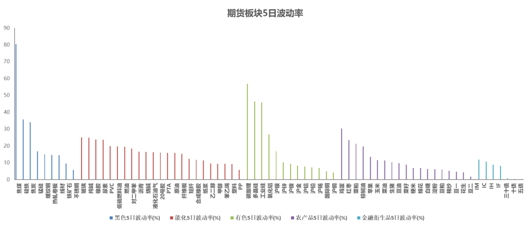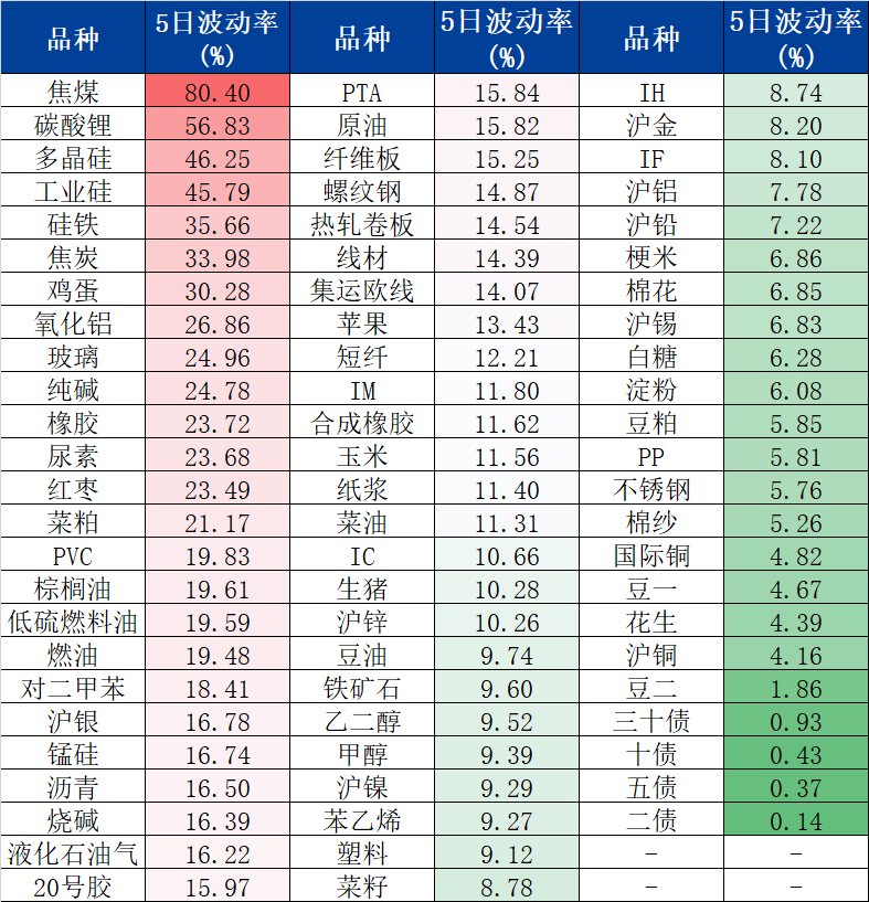 从5日波动率水平看,前三位为焦煤、碳酸锂和多晶硅;低波动前三品种为二债、五债和十债。