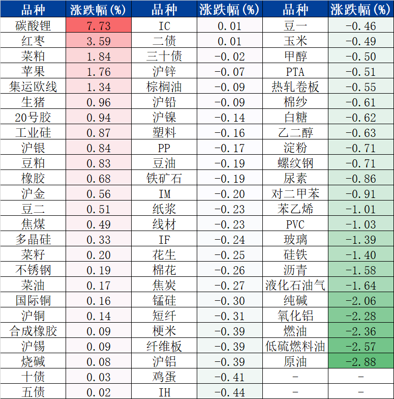 涨幅居前的三个品种分别是碳酸锂、红枣和菜粕;跌幅居前的是原油、LU燃油和燃油。