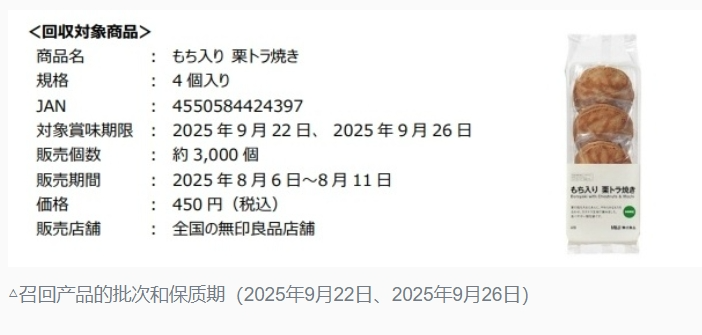 因部分原料中可能混入了异物,日本良品计划公司近日对“无印良品”品牌约3000个“4个装栗子铜锣烧”商品进行自主回收,销售日期在2025年8月6日至8月11日。相关公告称,截至目前没有消费者健康受损的报告。经核查,此款商品不在中国大陆的无印良品门店出售,但在中国大陆多个电商平台有代购,商品评价信息显示近期均有销售。请有意或已购买涉事商品的消费者留意,近期切勿购买或食用。