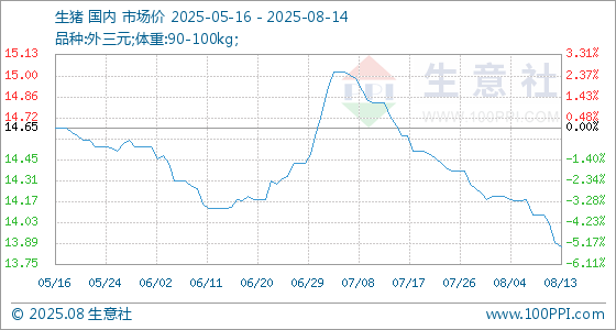 8月14日,生意社生猪基准价为13.87元/公斤,与本月初(14.18元/公斤)相比,下降了2.19%。