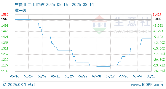 8月14日,生意社焦炭基准价为1391.25元/吨,与本月初(1341.25元/吨)相比,上涨了3.73%。