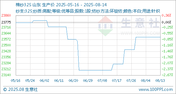 8月14日,生意社棉纱32S基准价为23600.00元/吨,与本月初持平。