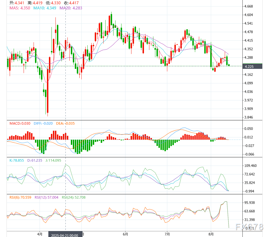 周三现货白银价格触及38.65美元/盎司,创出13个交易日新高;下一个阻力位在39.00,然后是年内的高点39.53。如果38.00跌破,下行风险在37.50和36.21处。周三,银价上涨超过1.63%,原因是美元全面走弱,交易员们已经完全消化了美联储下个月会议降息的预期。因此,与现货白银呈反向相关性的美国国债收益率随10年期基准债券下跌五个基点至4.236%。